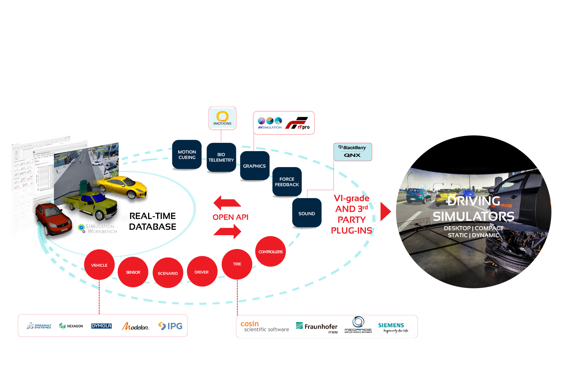 VI-grade develops and optimizes its Driving Simulators with a complete software suite for vehicle modeling, graphics, sound & vibration, and motion cueing, thus enabling an off-the-shelf, turn-key solution. In addition, VI-grade’s open architecture and Application Programming Interface (API) make it easy to integrate 3rd party software and hardware components, as often desired by customers. With the establishment of the VI-Certified program, we are taking a step forward with our partners to ensure that the best of these third-party applications work natively and seamlessly on VI-grade simulators without issue, thus saving customer time and money during deployment.
