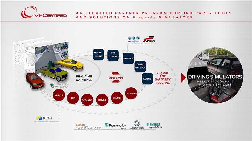 VI-grade entwickelt und optimiert seine Fahrsimulatoren mit einer kompletten Software-Suite für Fahrzeugmodellierung, Grafik, Sound & Vibration sowie Motion Cueing und ermöglicht so eine schlüsselfertige Standardlösung. Darüber hinaus vereinfachen die kompatible Architektur und das Application Programming Interface (API) von VI-grade die Integration von Software- und Hardwarekomponenten von Drittanbietern, was dem Kundenwunsch entspricht. Mit der Einführung des VI-Certified Programms macht VI-grade gemeinsam mit seinen Partnern einen großen Schritt nach vorn, indem die besten Drittanbieter-Anwendungen fortan standardmäßig und reibungslos auf VI-grade-Simulatoren funktionieren. Der Kunde wiederum spart durch die schnellere Einbindung Zeit und Geld.