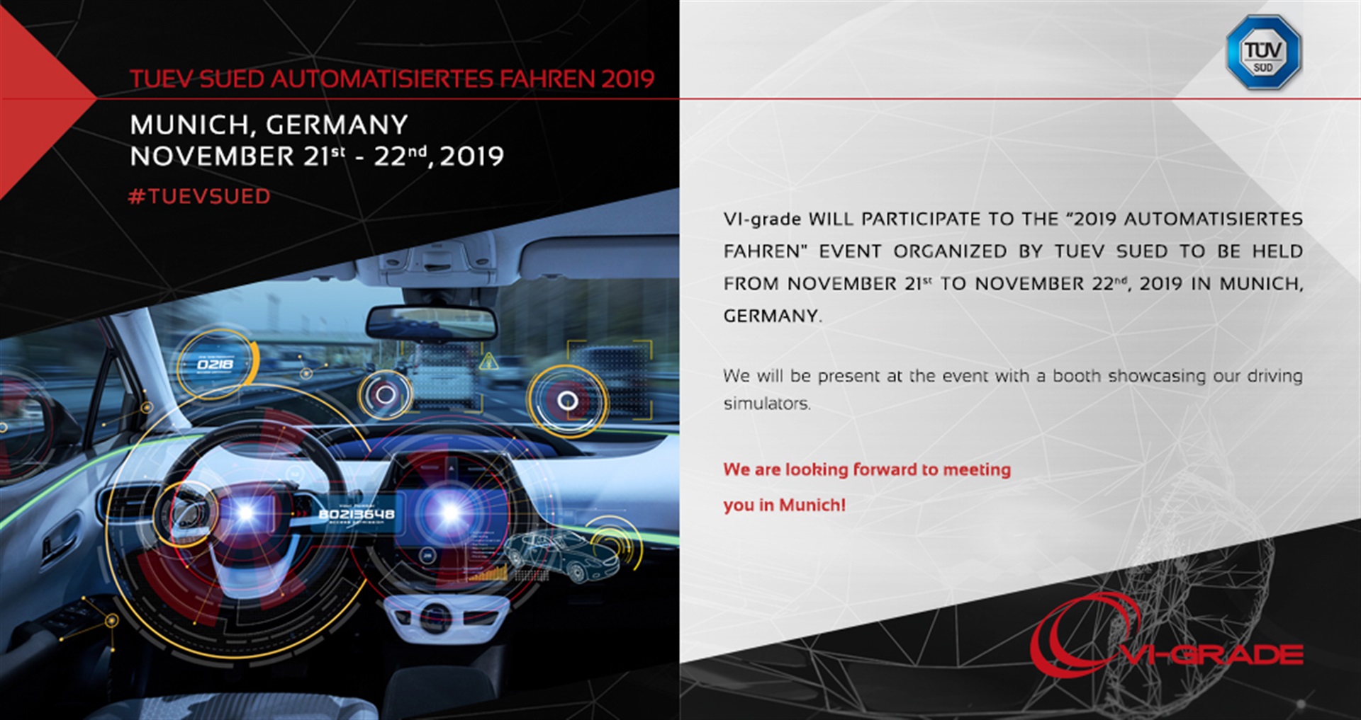 VI-grade will participate to the “2019 Automatisiertes Fahren" event organized by TUEV SUED to be held from November 21st to November 22nd, 2019 in Munich, Germany.