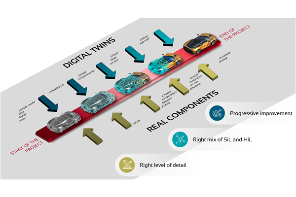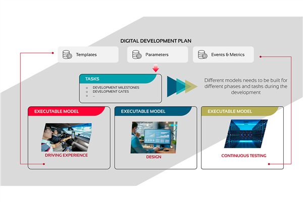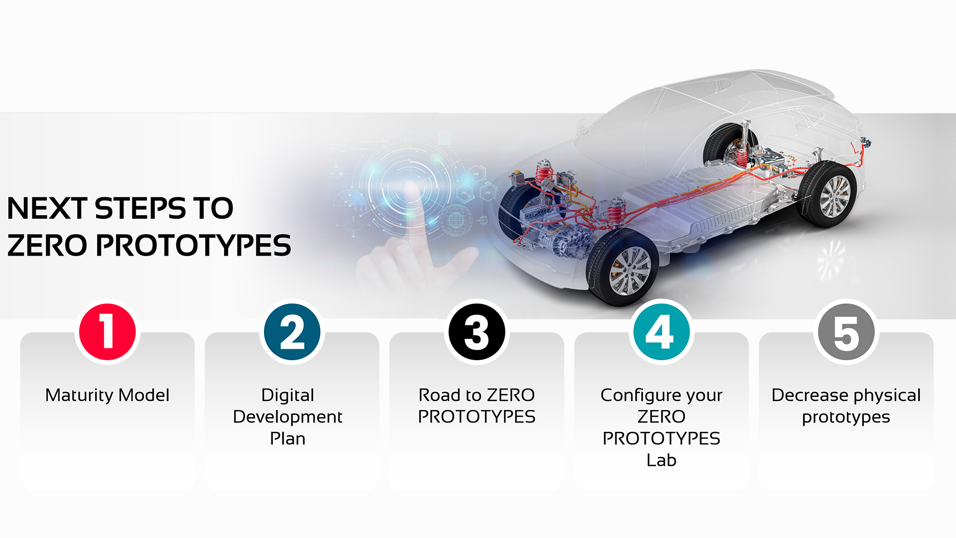 The path to "Zero Prototypes" development begins with evaluating the current maturity level of virtual processes. A Digital Development Plan is then created to define processes for creating accurate digital twins for use in driving simulators.