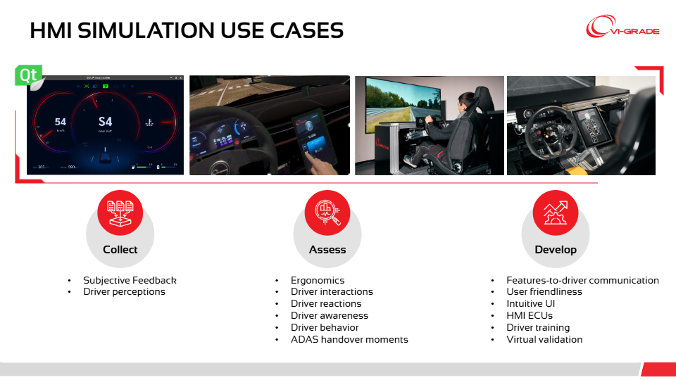 VI-gradeのHMIシミュレーション・ソリューションは、ヒューマン・マシン・インターフェースのシームレスな設計、テスト、検証を可能にします。ドライバーのフィードバックを収集し、人間工学とインタラクションを評価し、直感的なUIを開発することで、当社のシミュレーターはユーザーエクスペリエンス、安全性、効率を向上させます。