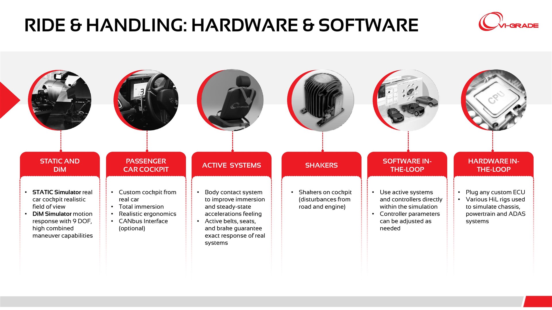 VI-gradeのドライビングシミュレータは他の追随を許さない能力を持ち、ビークルダイナミクスとライド&ハンドリングのOEM開発において業界をリードしています。当社のソフトウェアは、ドライビングシミュレータの機能とシームレスに統合できるよう独自に設計されています。ステアリングフィール、限界ハンドリング、シャシー制御など、VI-gradeのソリューションエコシステムは他に類を見ません。