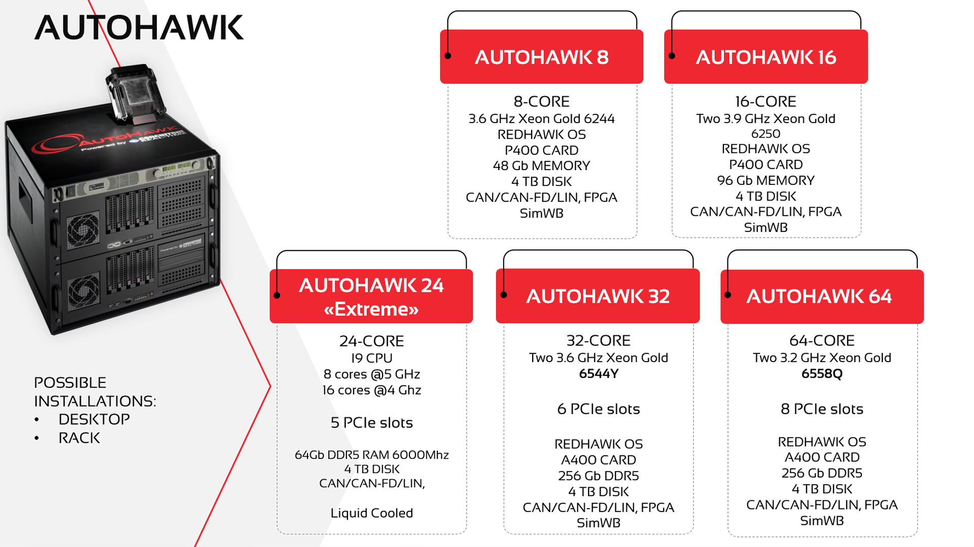 AutoHawkは、 最新の8、16、24、32、64コアを搭載した5つの 標準構成で、プロジェクトとログデータを管理します。すべてのシステムには、CAN、CAN FD、LINをサポートする通信カードが付属しており、さらに複数のIOボードやその他の自動車通信プロトコル(FLEXRAY、SENT、EtherCat、Automotive Ethernetなど)、アナログおよびデジタル信号用の完全にプログラム可能なFPGA ボードで拡張する ことができます。