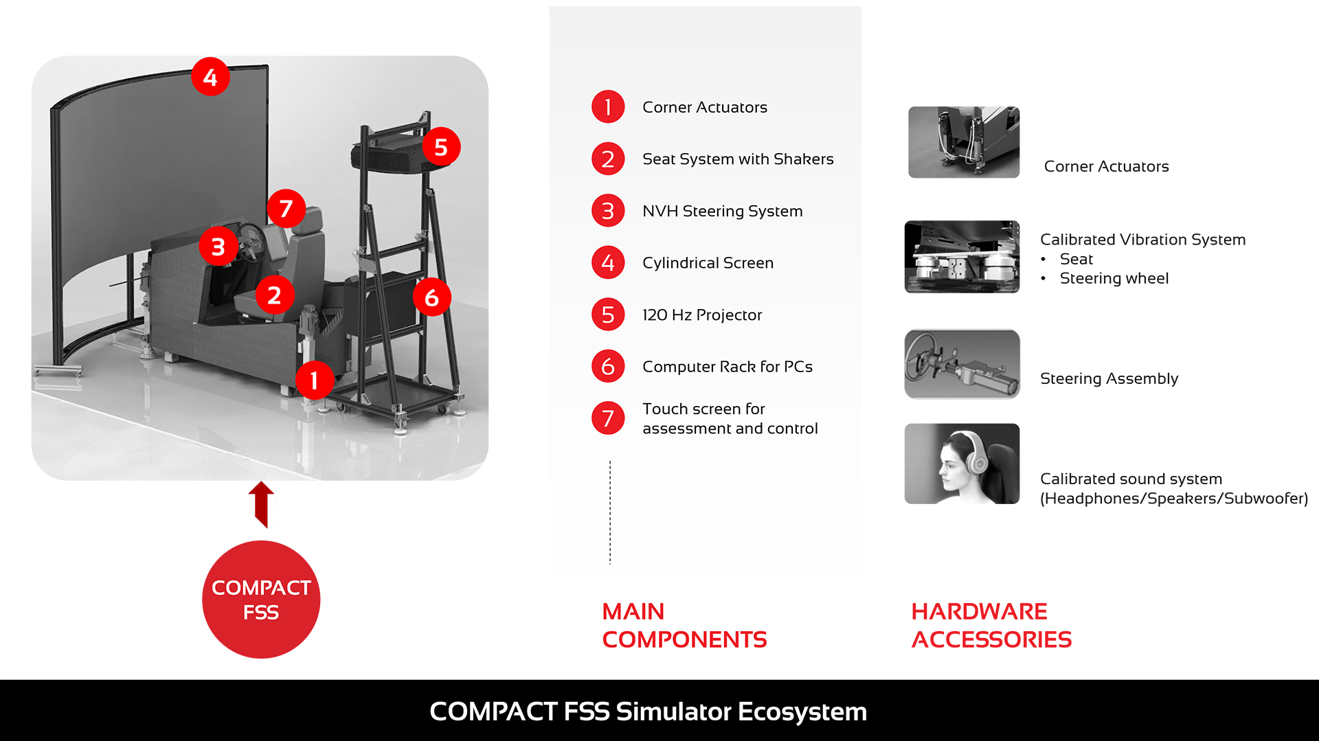 COMPACT FSSは、小さな設置面積で高精度なモーション、振動、サウンドを提供します。これは、客観的なシミュレーションデータと主観的な人間の知覚との間の重要な接続であるHuman-in-the-Loopシミュレーションを可能にします。