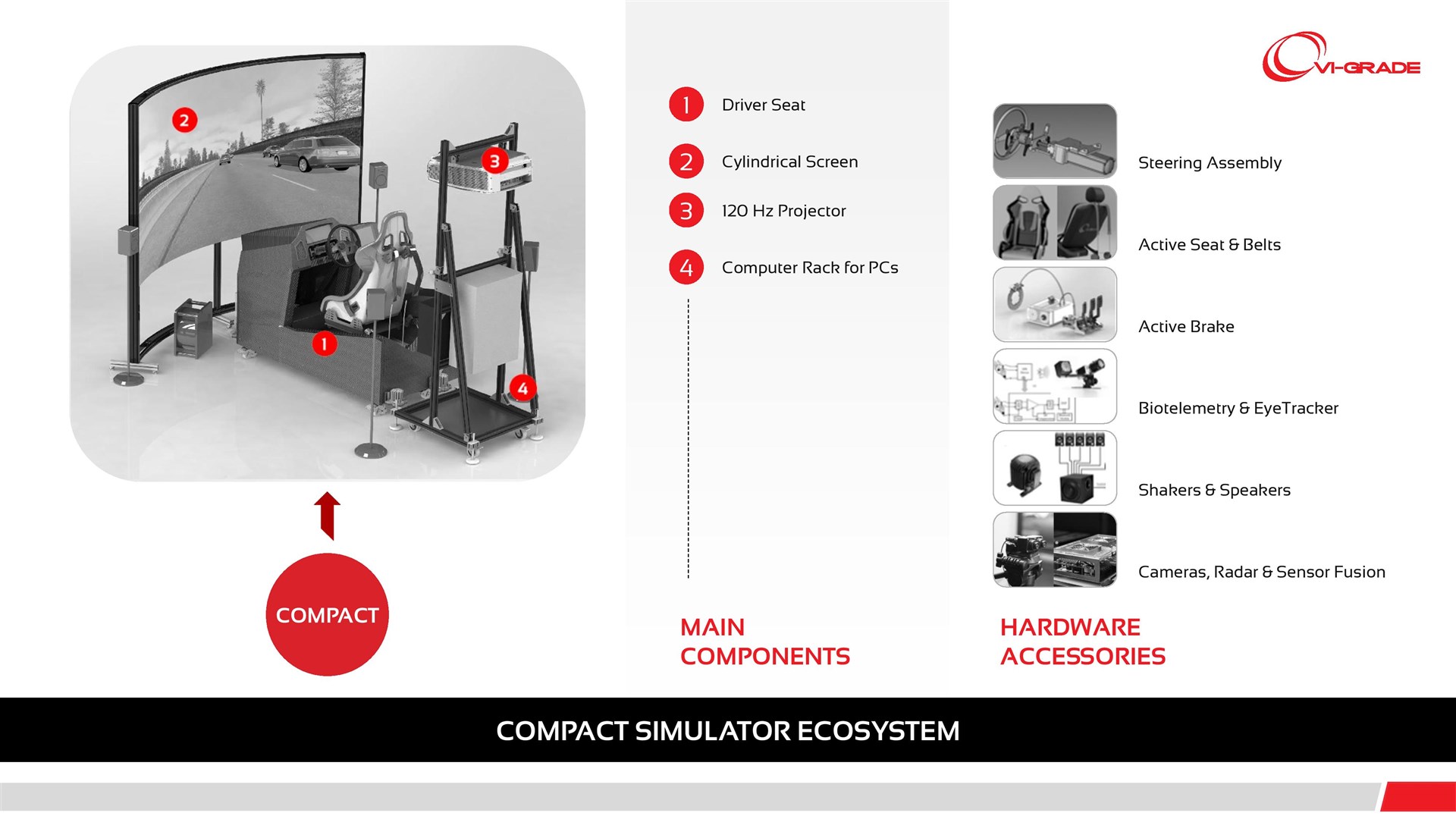 VI-gradeのCOMPACTシミュレータは、より高度なシミュレータ(STATICと DiMの両方)に使用するモデルを準備したい自動車OEMや 、特定のコンポーネントを迅速にテスト する必要がある場合に理想的なツール です。