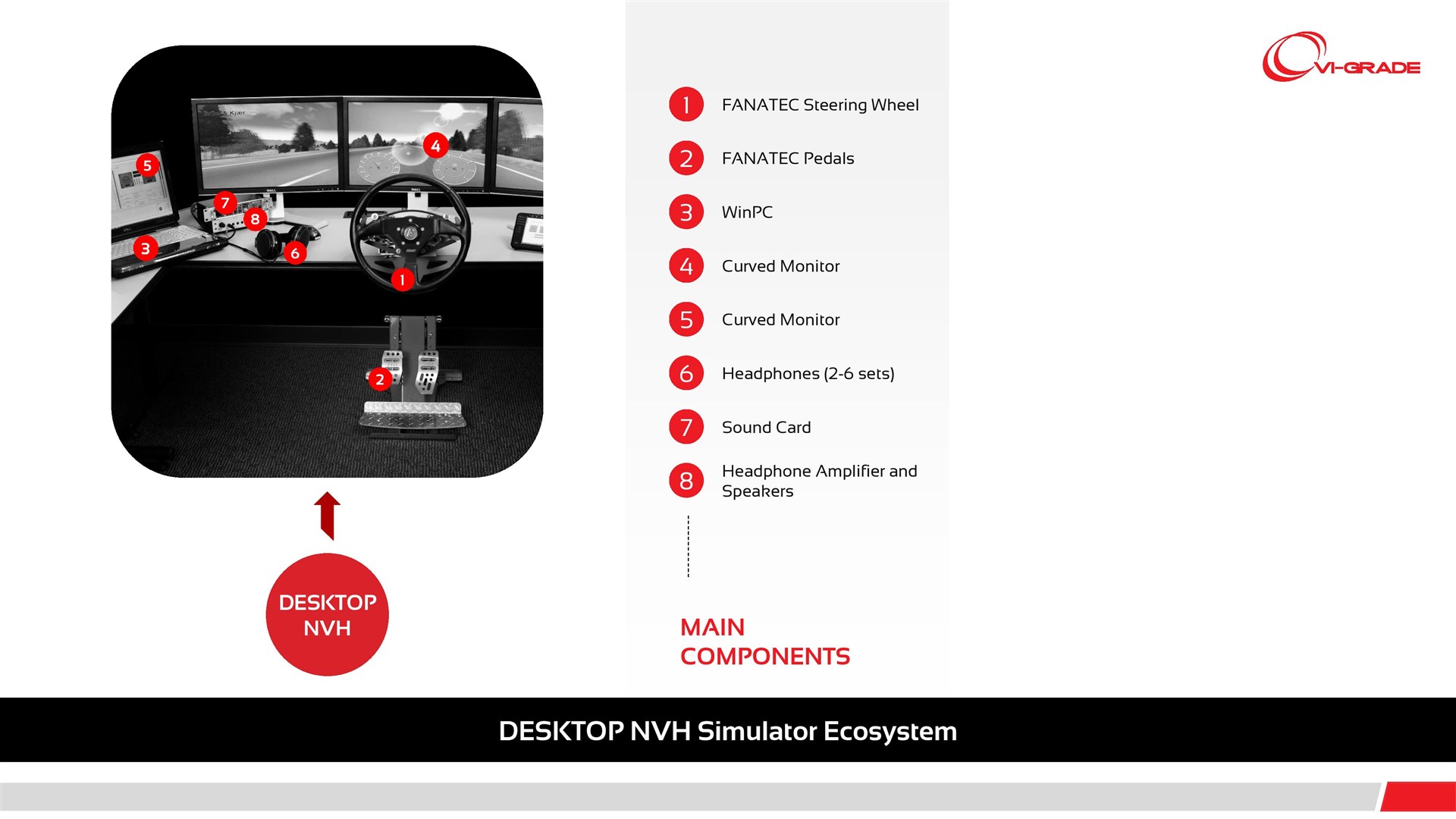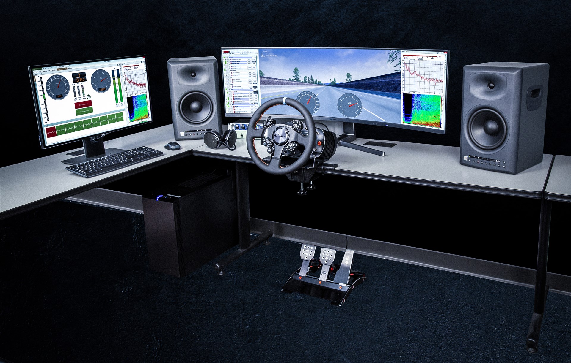 VI-NVHSimソフトウェアを中核とするDESKTOP NVH Simulatorには、ステアリングホイールとペダルが装備されており 、ドライバーは車両と対話し、リアルタイムで車両の音を体験することができます。