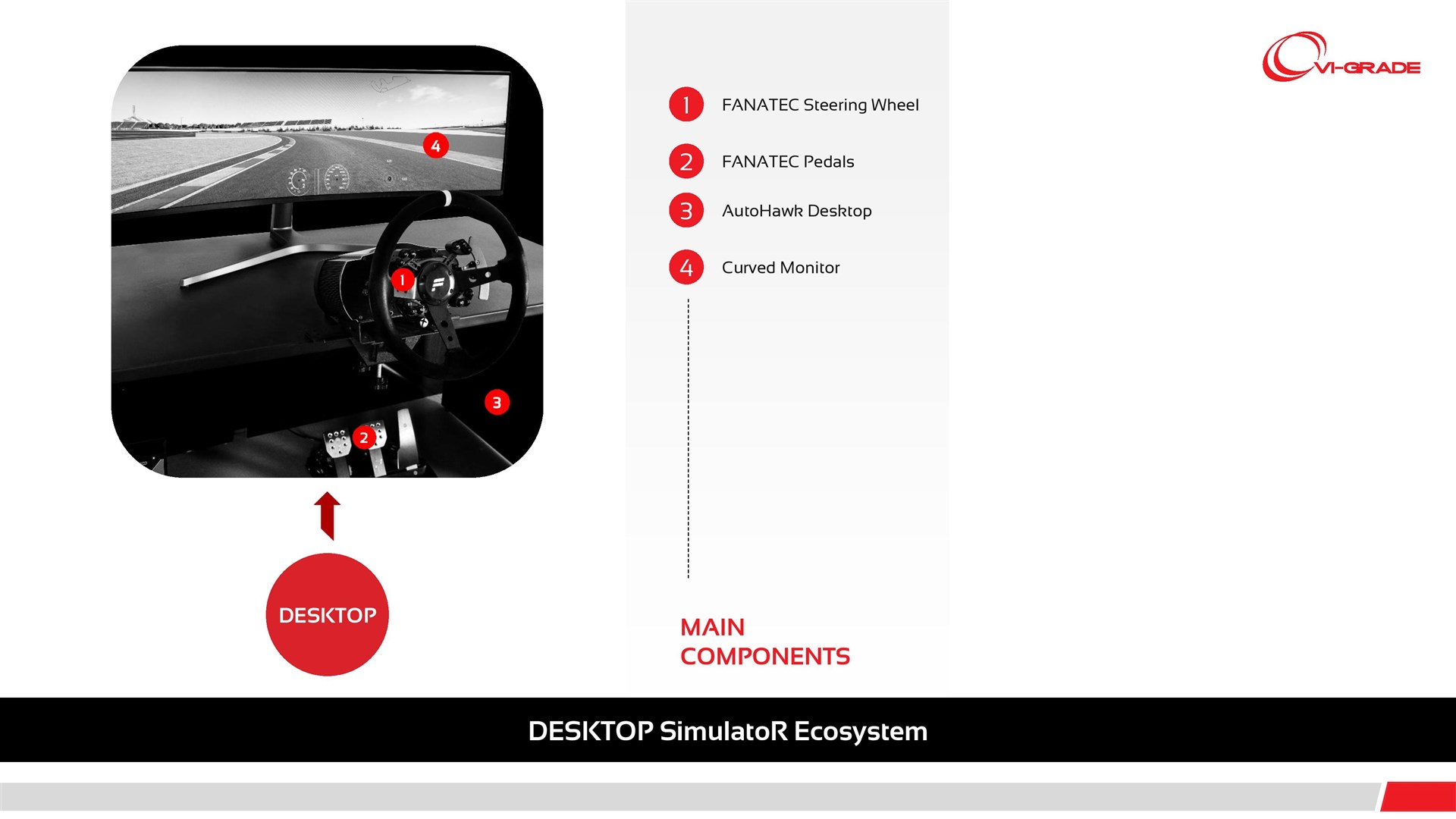 DESKTOP Simulatorは 、VI-gradeが提供するドライビングシミュレータ製品ラインのエントリーレベルのソリューションです。机上から直接車両をテストドライブし、基本的な挙動を確認することができます。
