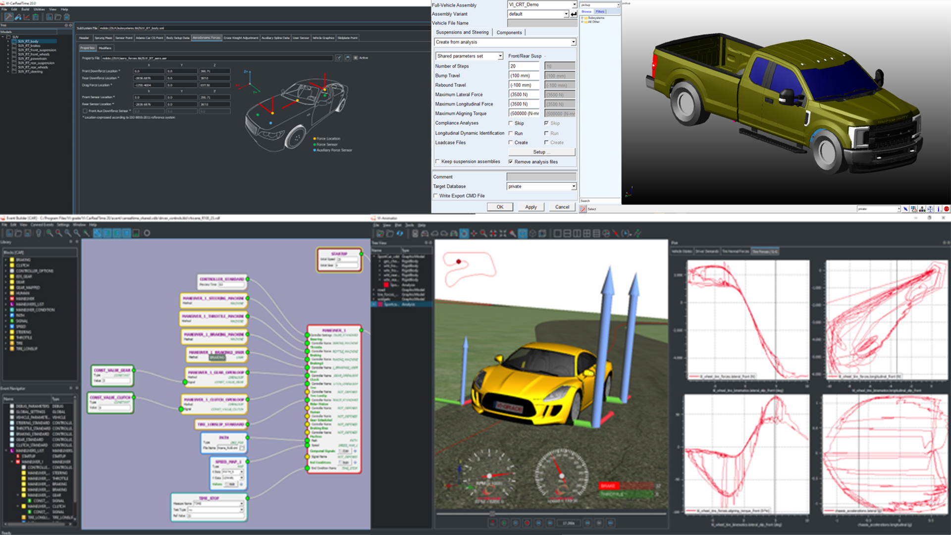 VI-CarRealTimeにより、ビークルダイナミクスのエンジニアは、大規模な実験計画法(DOE)や多目的最適化スタディを迅速かつ容易に実行することができます。VI-CarRealTimeは、ADAMS CarやK&Cの結果からリアルタイム車両モデルを自動的かつシームレスに直接エクスポートできる、市場で唯一のリアルタイム・ソリューションです。同様に、VI-CarRealTimeはタイヤ、スプリング、ダンパー、バンプストップなどのコンポーネントプロパティファイルをADAMS Carと共有することもできます。