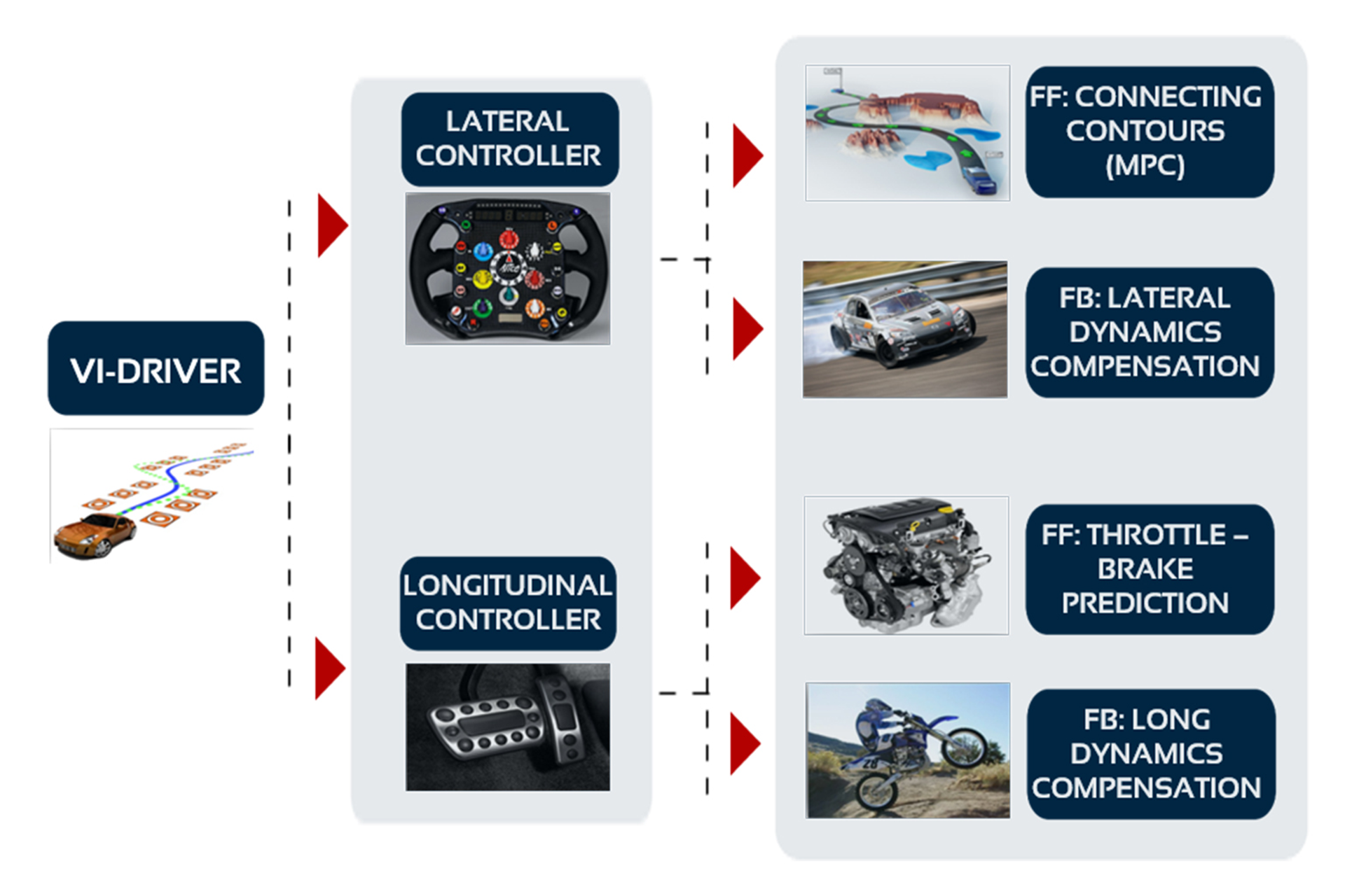 VI-Driverは 、複雑化する統合システムの開発をサポートします:車両プラントは、正確なサスペンション、タイヤ、空力およびパワートレインコンポーネントを備えた高速マルチボディシンボリックシミュレータによって実現されます。